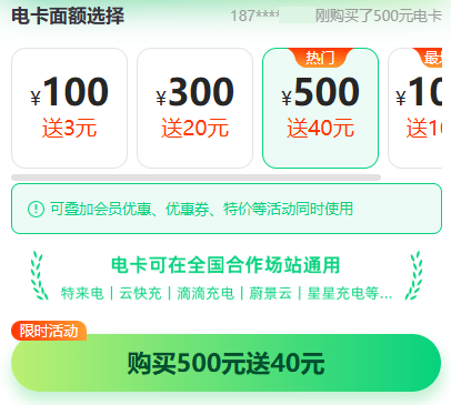二 为什么使用电卡充电? 充电更优惠!可全额支付充电费用,相当于电费也打折,还可叠加会员折扣、优惠券、特价站等活动同时使用; 电卡可在全国合作场站通用! 特来电|云快充|滴滴充电|蔚景云|星星充电等...... 使用电卡,无需频繁预付,一键启动,充电快人一步~ 📢 最后提醒: 活动限时! 随时停止! 有需要的师傅们抓紧时间选购吧~