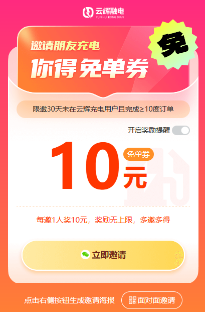 云辉融电福利,邀友就送10元无门槛充电券!